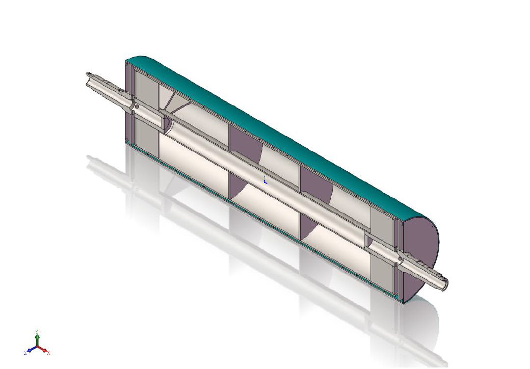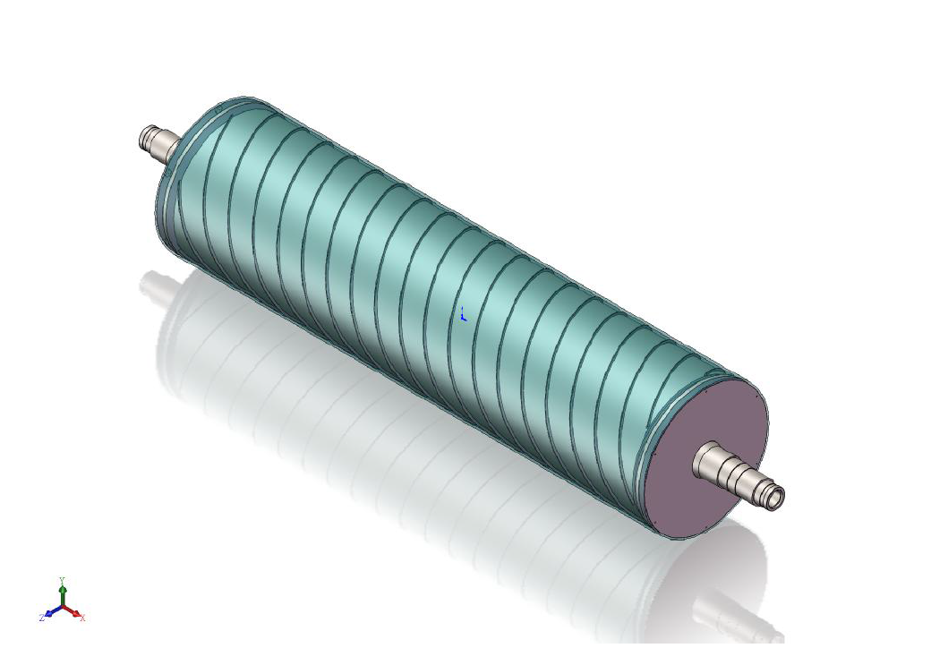 雙流道大直徑流延主冷輥,包括輥筒、進水導流器、出水導流器,進水軸頭管和出水軸頭管,輥筒包括外筒、與外筒同軸設置的內(nèi)筒和在外筒、內(nèi)筒之間設置的多個螺旋導流片,相鄰兩個螺旋導流片構(gòu)成一個螺旋導流槽,進水導流器、出水導流器分別固定連接在輥筒的兩端,進水軸頭管和出水軸頭管分別安裝在進水導流器、出水導流器上。大直徑流延主冷輥,結(jié)構(gòu)簡單,由于設置了進水導流器和出水導流器,可有效降低主冷輥內(nèi)部的流動阻力,能夠使得流入輥筒內(nèi)的冷卻水量更加均勻,提高主冷輥的送水能力,提高主冷輥冷卻效率,有效提高輥筒表面的溫度均勻性,節(jié)約能耗。